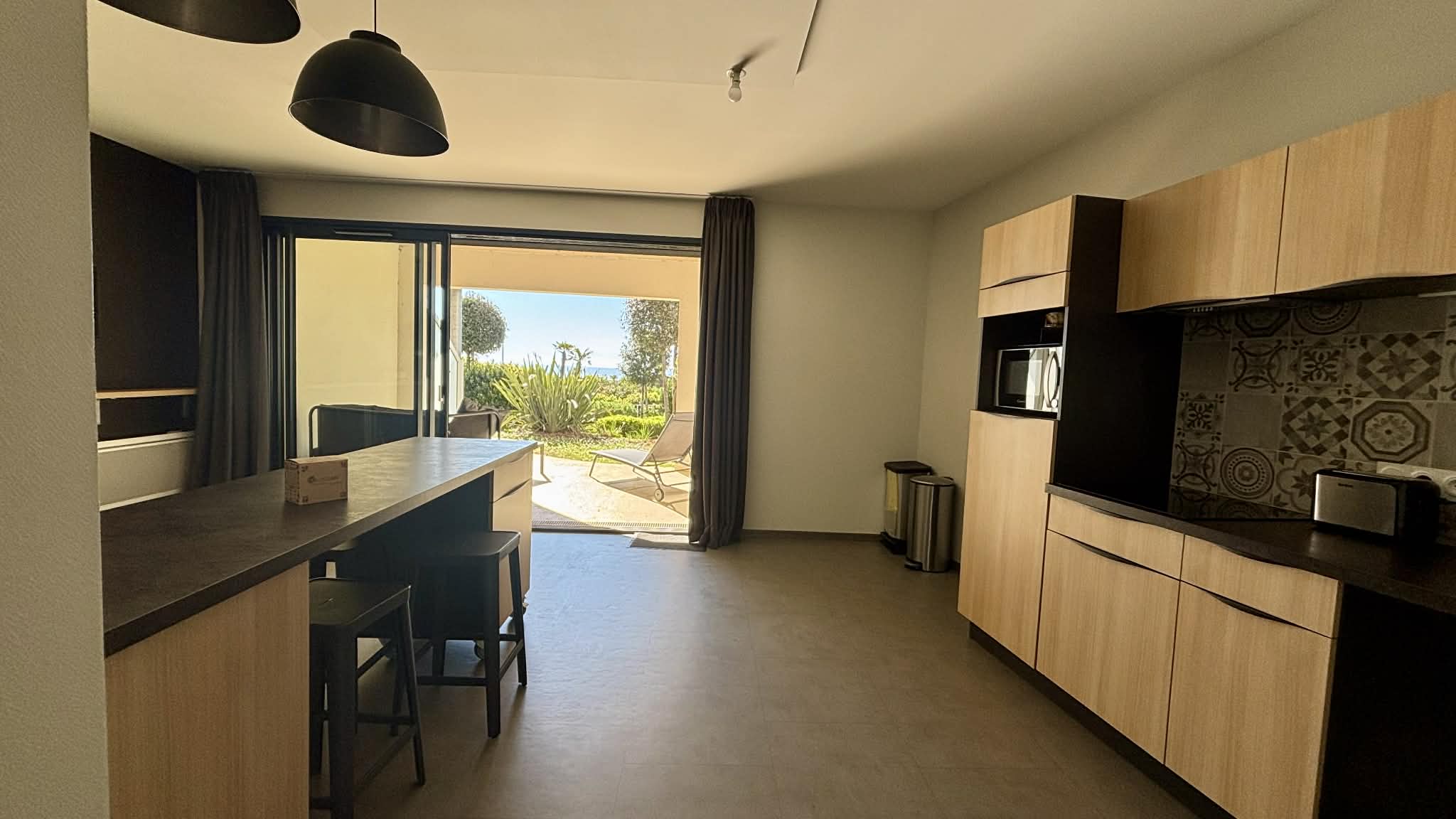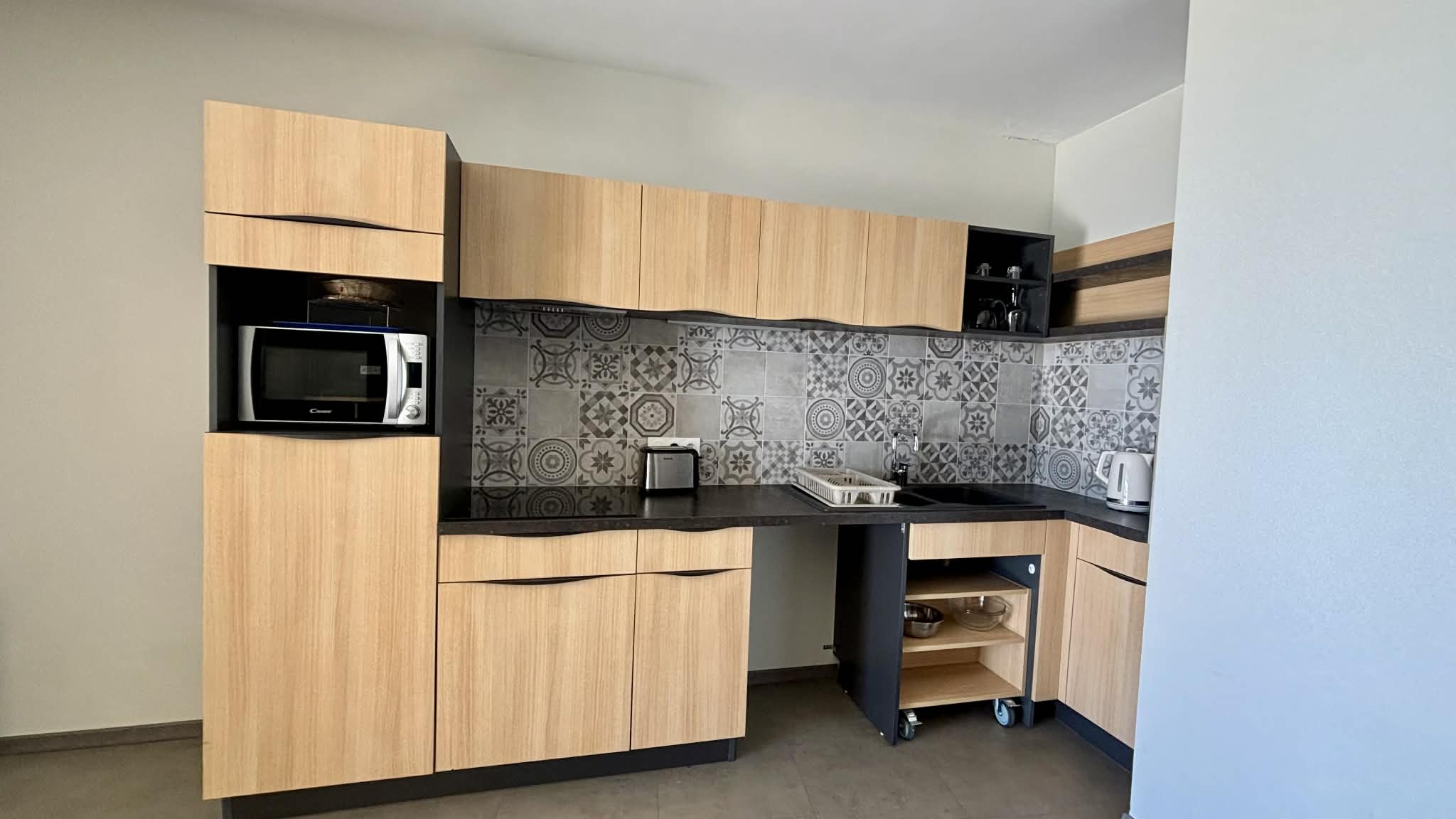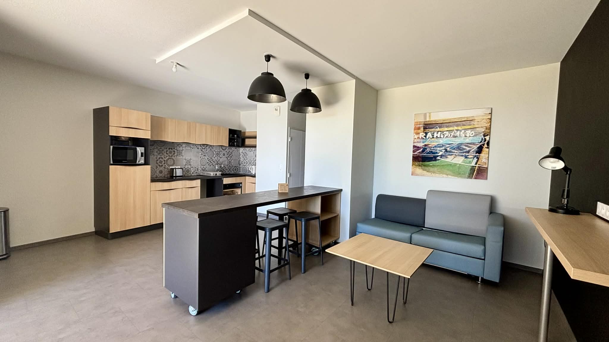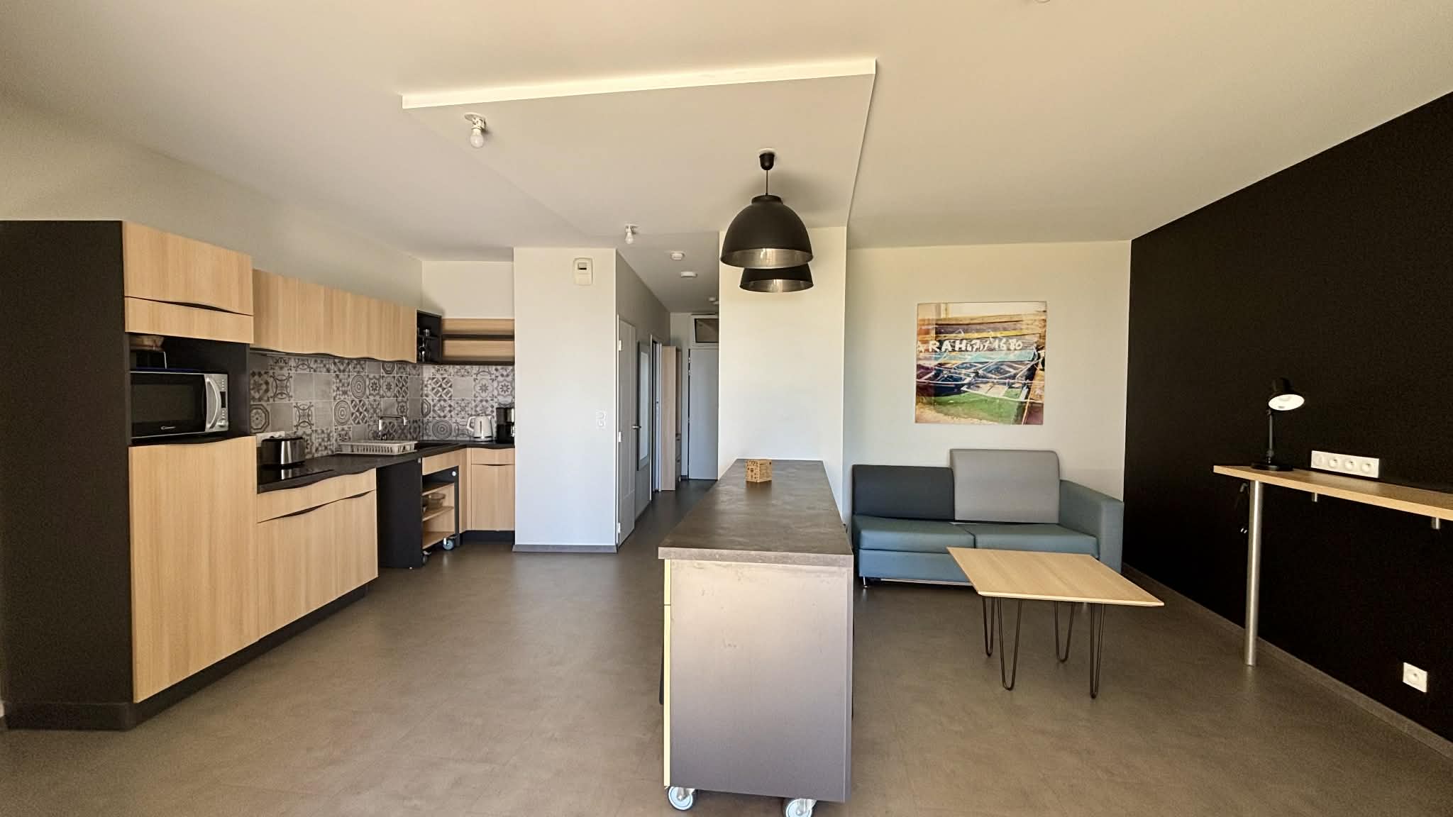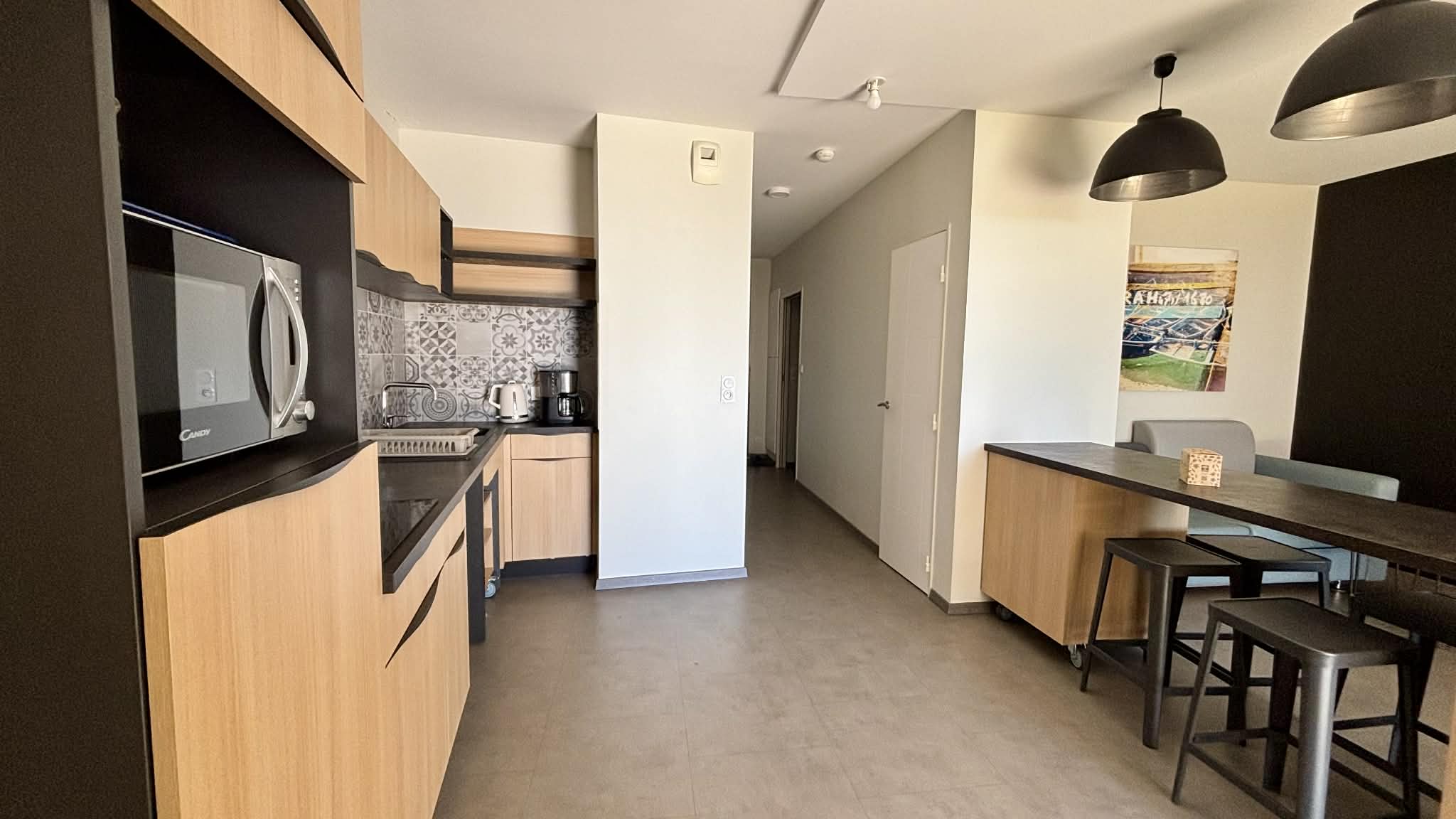 Cuisine équipée et aménagée ouverte (micro-ondes multifonctions, réfrigérateur/freezer, plaque induction, cafetière à filtre, grille-pain, bouilloire),