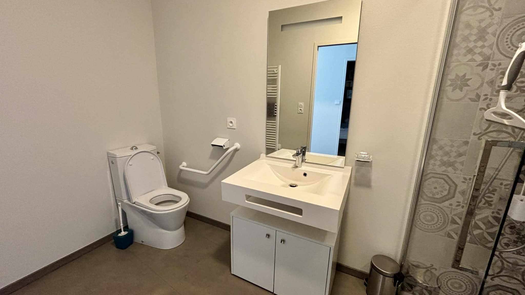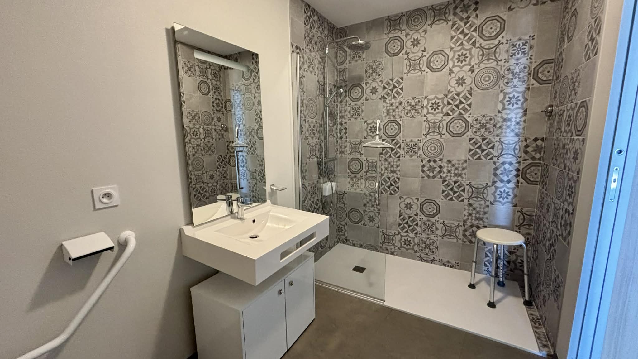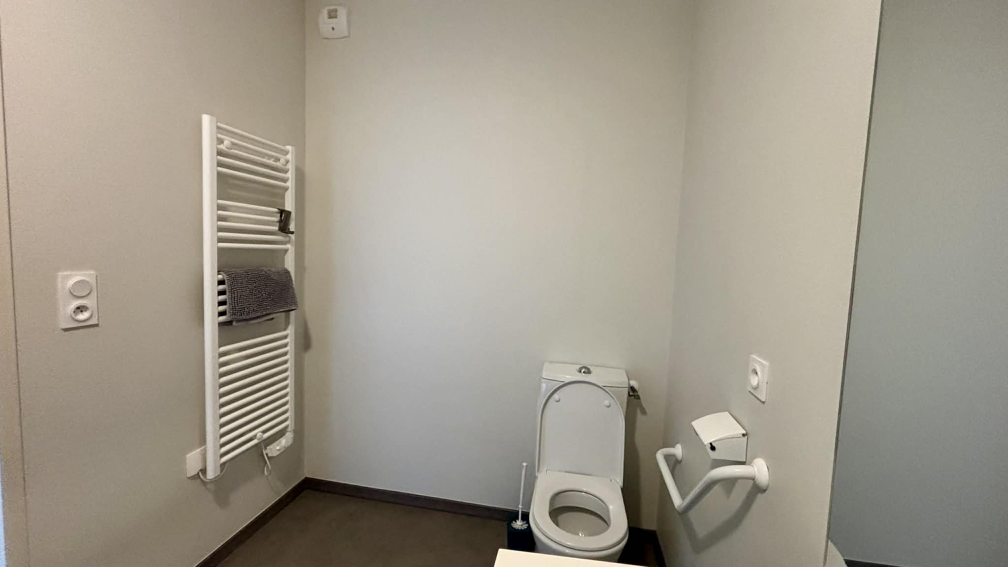 Salle d'eau avec douche à l'italienne, meuble vasque, sèche-serviette et WC,