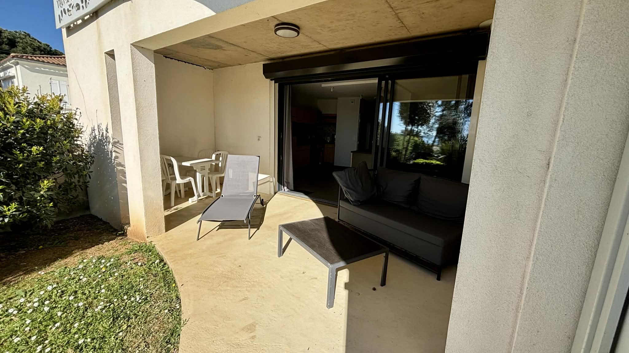 Terrasse en rez de jardin avec canapé, chilienne, table et chaises pour les repas.